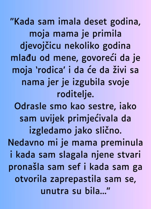 Nedavno sam izgubila mamu. Bol je bila ogromna, a dok sam slagala njene stvari svaka sitnica me podsjećala na nju. Tada sam naišla na mali sef, vješto sakriven među stvarima. Srce mi je ubrzano kucalo dok sam ga otvarala, kao da slutim da unutra leži odgovor na ono što sam cijelog života osjećala.