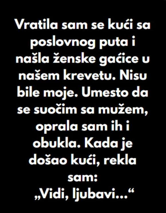 Posle nekoliko dana poslovnog puta, vratila se kući umorna, ali srećna što je ponovo u svom mirnom domu. Nije slutila da će taj povratak zauvek promeniti sve. Ušla je u spavaću sobu, spustila torbu i pogledom prešla po krevetu. Sve je delovalo uobičajeno — dok nije primetila nešto što nije pripadalo njenom svetu. Na jastuku su ležale ženske gaćice. Tuđe. Ni po veličini, ni po boji, ni po stilu nisu bile njene.