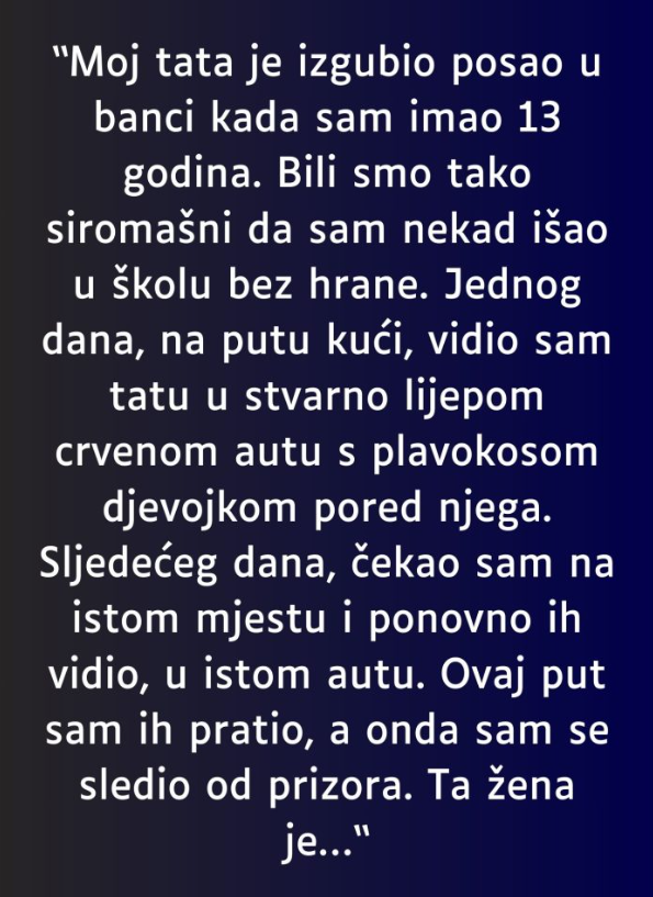 U tim teškim danima dogodio se trenutak koji mi je promijenio pogled na ljude. Vraćajući se kući, ugledao sam oca u lijepom crvenom automobilu, a na suvozačevom mjestu bila je mlada plavuša. Nisam mogao vjerovati svojim očima — u meni su se pomiješali bol, sram i bijes.