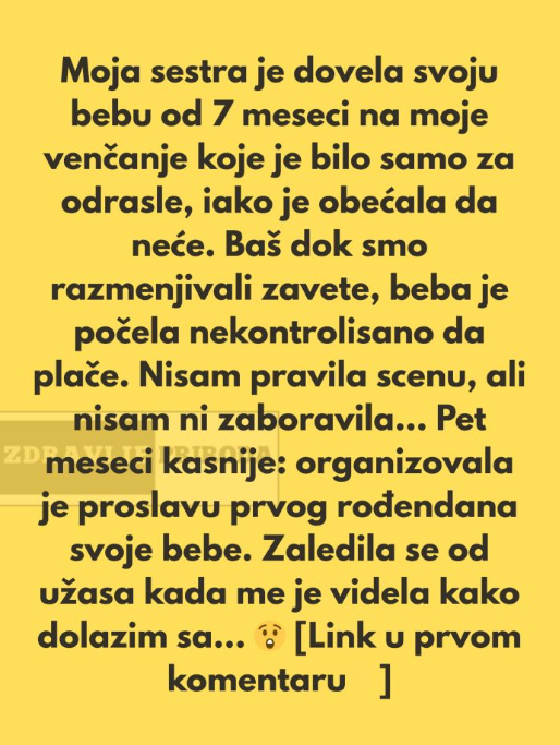 Svi su poštovali tu želju — osim njene sestre, koja je imala bebu od sedam mjeseci. Mlada joj je čak rekla da će razumjeti ukoliko ne dođe, jer zna koliko je teško organizovati čuvanje tako malog djeteta. Sestra je rekla da razumije… ali se na kraju ipak pojavila, i to s bebom u naručju.
